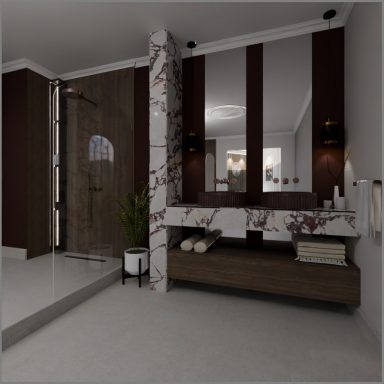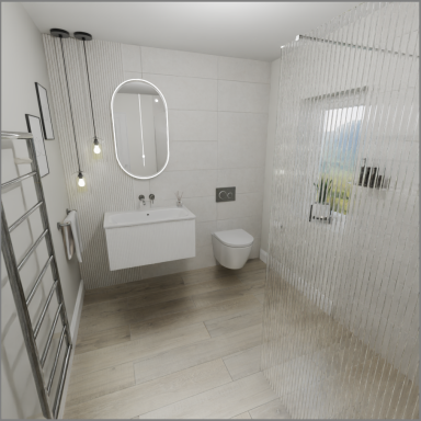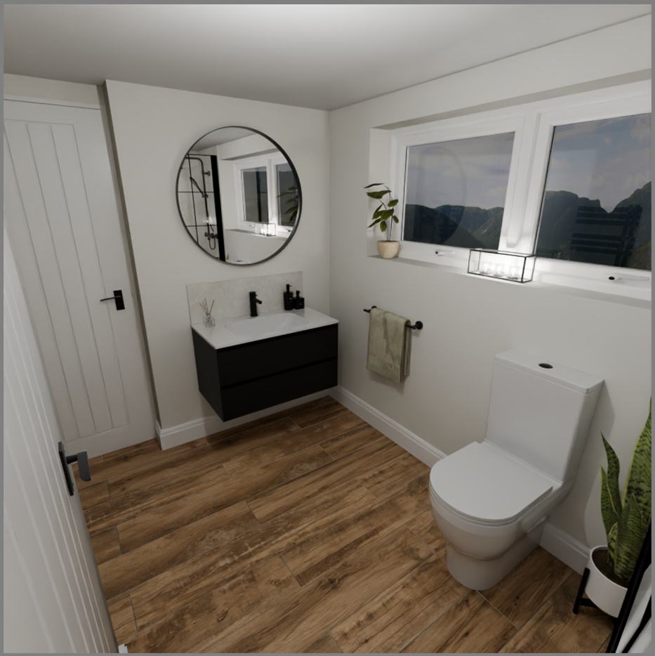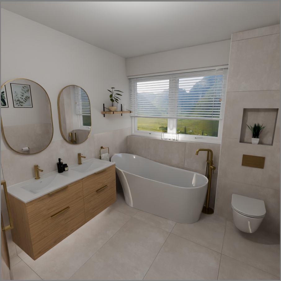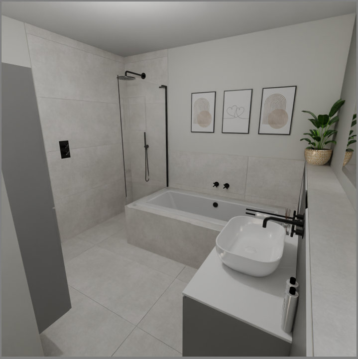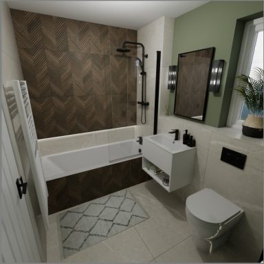 Grey bathrooms can be elevated with a warm wood effect tile design.