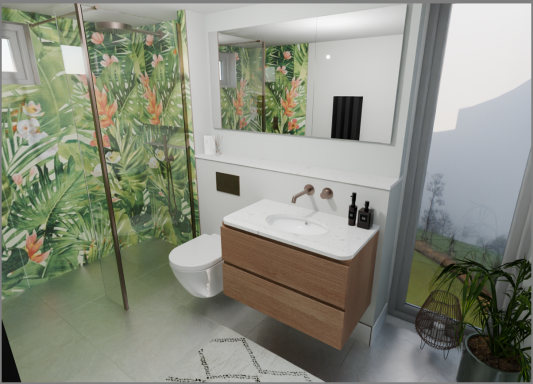A Beautifully modern bathroom featuring a green accent wall, a neutral palette and a bespoke wooden vanity unit.